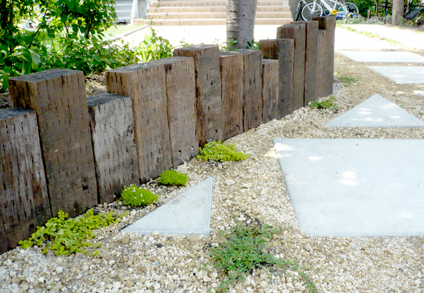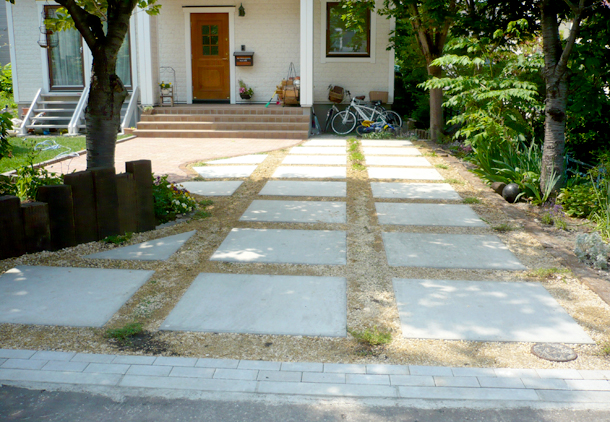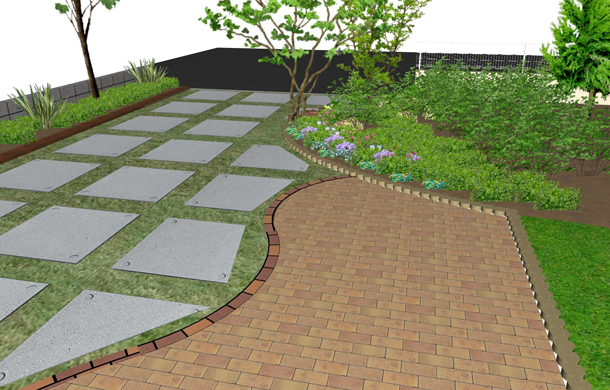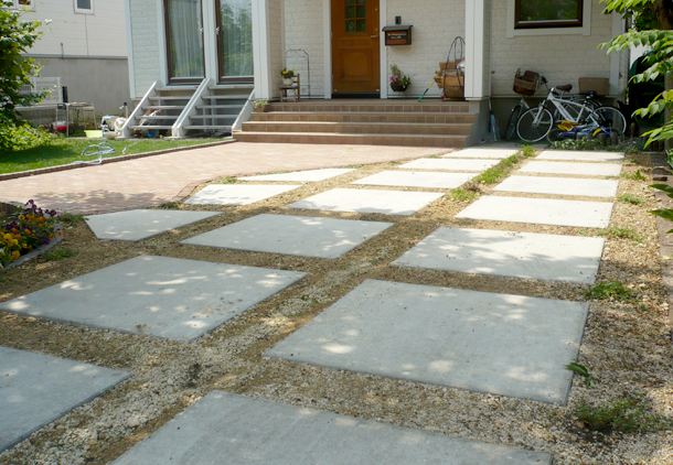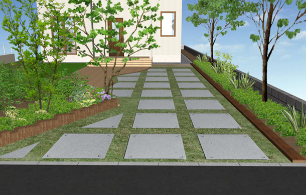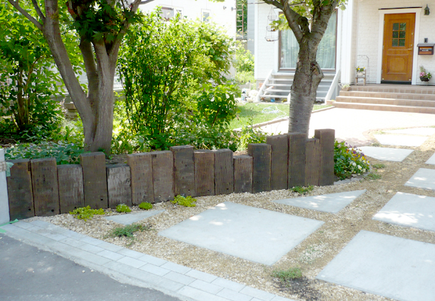 路盤:アプローチと駐車スペースをインターロッキング、ドットペイブで分け、ドットペイブはあえてすき間をあけて配置し、すき間部分にはお客様自身でハーブの植込を予定しています。花壇の仕切りには枕木とネオガーデンを使用し、様々な表情を楽しめるお庭になっています。