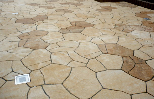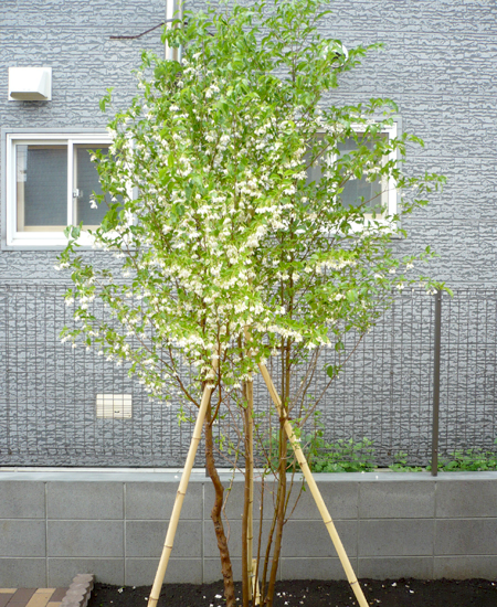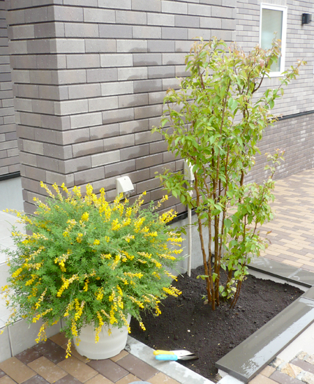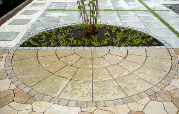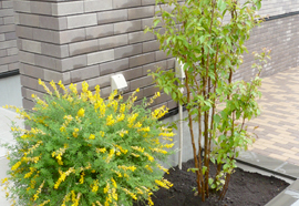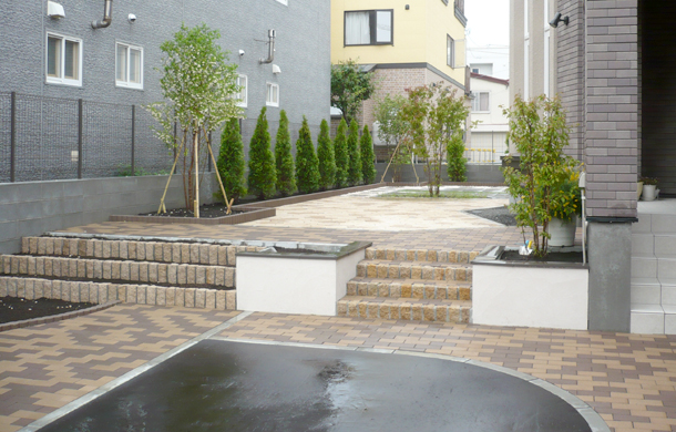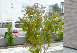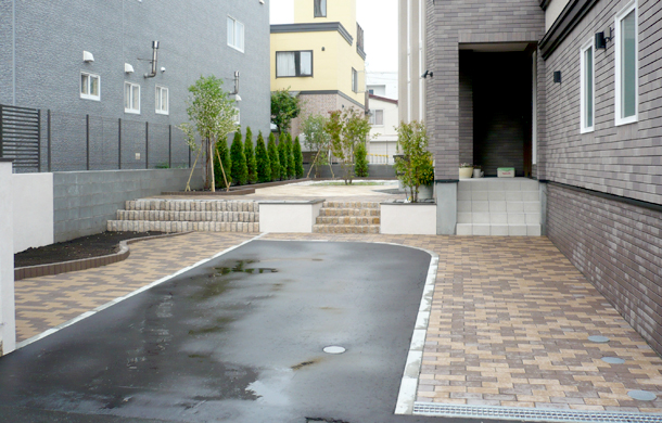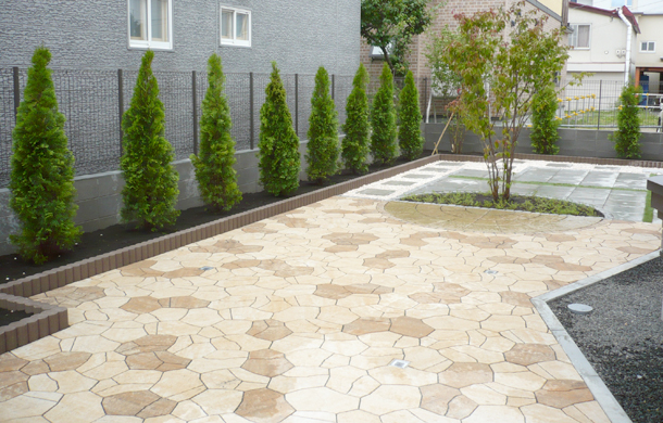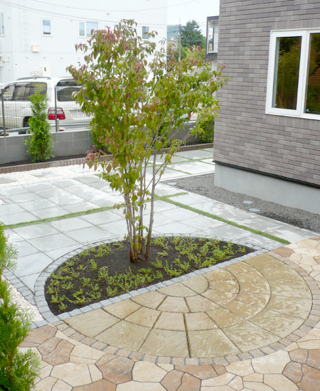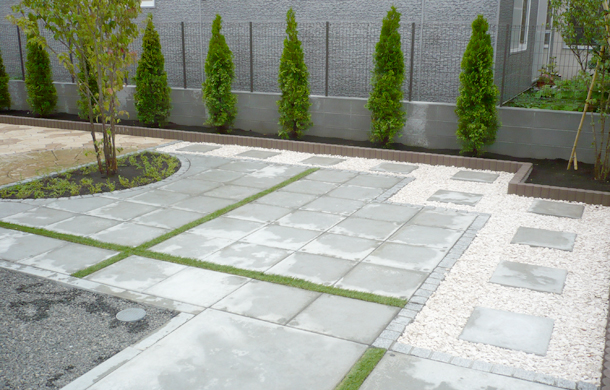 路盤、植栽、フェンス:路盤を中心に設計したお庭は、ドットペイブやティーナを使い、 ハーフサークルや人工芝のラインを入れる等、様々な素材を組み合わせることによって表情のあるお庭になっています。 また、埋め込み式のソーラーライトの【エスコート】が足元をやさしくライトアップしエスコートしてくれます。 植栽はヒメシャラやヤマボウシ、エゴの木など8種類の木を植え、季節ごとに様々な表情を見せてくれます。