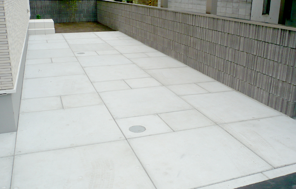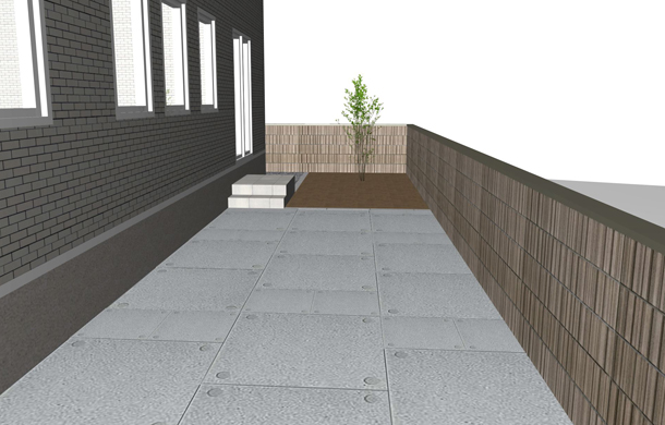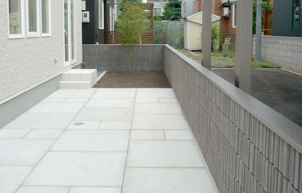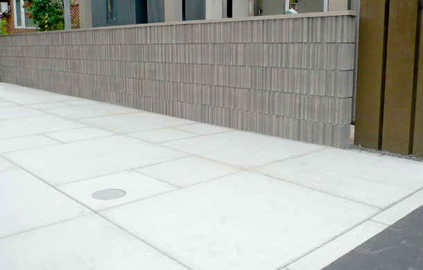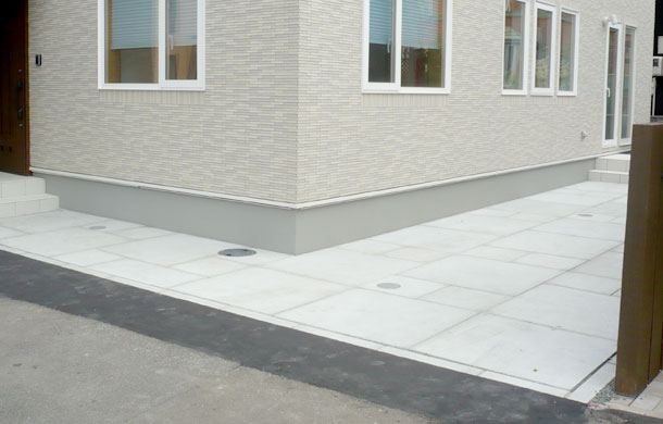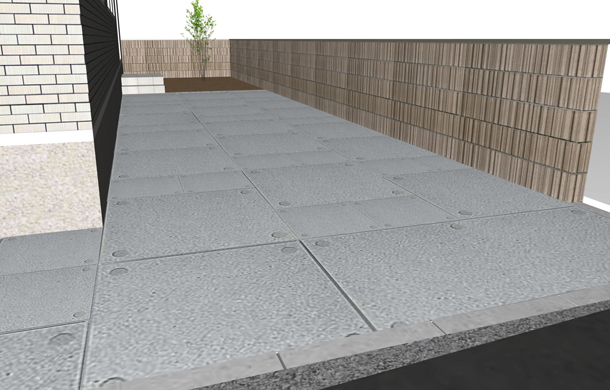 路盤、塀:ドット模様がアクセントのコンクリート平板【ドットペイブ】を使用しています。 500タイプと1000タイプを組み合わせることによって、変化のあるスタイリッシュな雰囲気になります。塀には化粧ブロックの【リベルタストーン】とアルミ素材の笠木【スタイリッシュキャップ】を組み合わせています。ランダムなデザインで洗練されたフォルムのリベルタストーンは、ナチュラル、モダン、和風を問わず全てのスタイルを引き立ててくれます。
