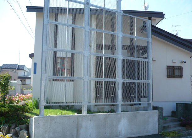 雪止めフェンス:屋根からの落雪が道路へ越境するのを防ぐ雪止めフェンスを設置しました。 表面は錆に強い亜鉛メッキ仕上げで、通常の塗装仕上げに比べ約3倍~4倍の耐久性があります。 屋根の形状に合わせ施工することが出来ますので、お気軽にお問合せください。