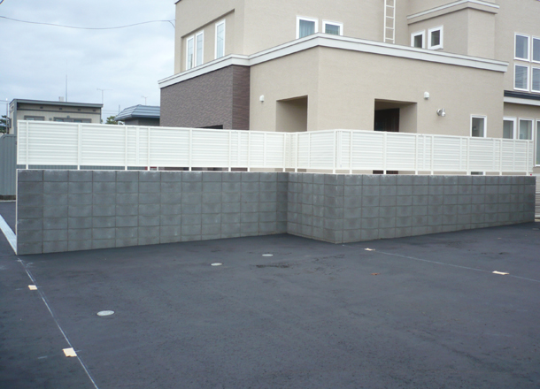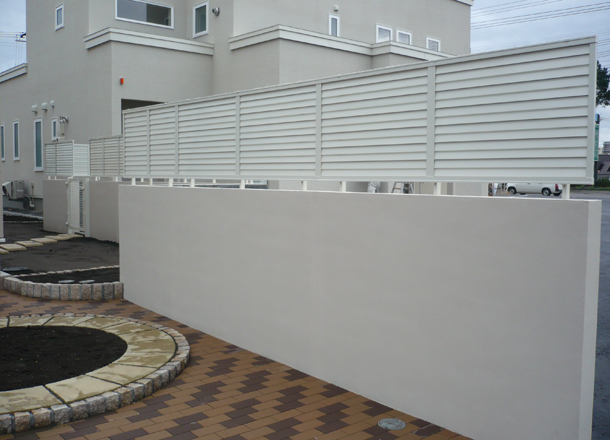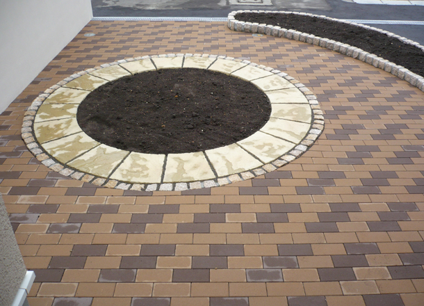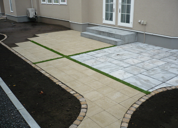 路盤、ブロック塀、フェンス、テラス:アプローチ部分はお花や緑を多く植栽できるよう、花壇スペースを大きく確保しました。サークル部分の中央に木を植栽することで、お家を出入りする際道路からの視線を遮ることができます。単調になりがちなテラス部分には、異素材のインターロッキングを使用することで、動きのあるお庭ができました。