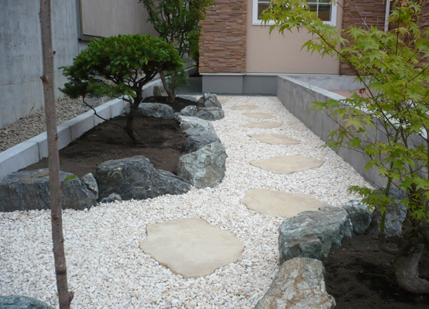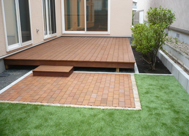 ウッドデッキ、人工芝、植栽スペース:お庭部分にリビングから繋がるウッドデッキを作成致しました。ウッドデッキはサイズやお色など、お客様のご要望に合わせて作成することができます。ウッドデッキ横には、バーベキューの際に火を扱えるようインターロッキングを敷いてあります。色を合わせたことで統一感があり、素敵なお庭になりました。 アプローチには既存の植栽にあうようゴロタ石で仕切を作りました。化粧砂利が全体の雰囲気を明るくしてくれます。