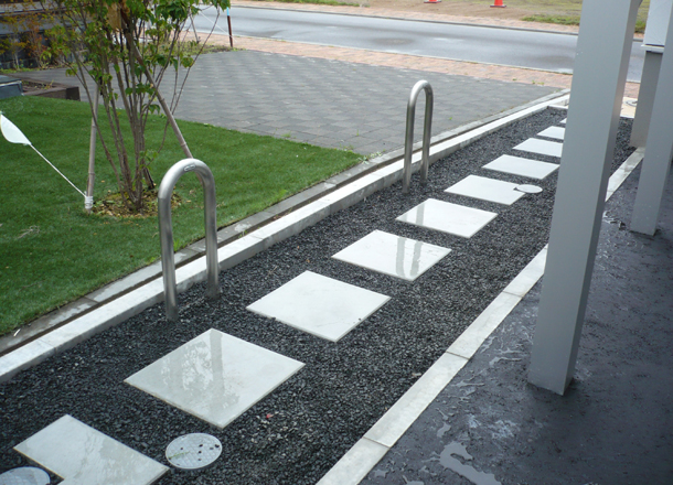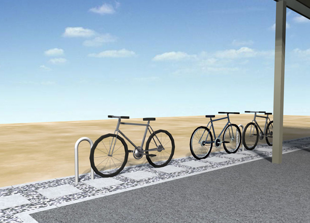 自転車置き場:通常車止めで使用する商品を自転車置き場に設置しました。車止めを利用し自転車のキーチェーンをつけることができます。