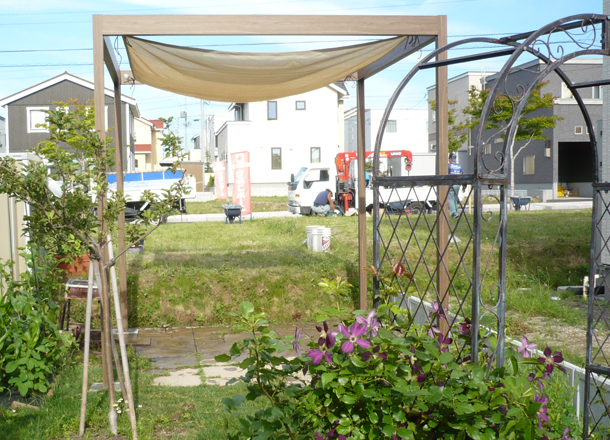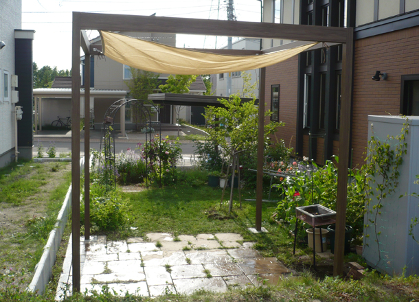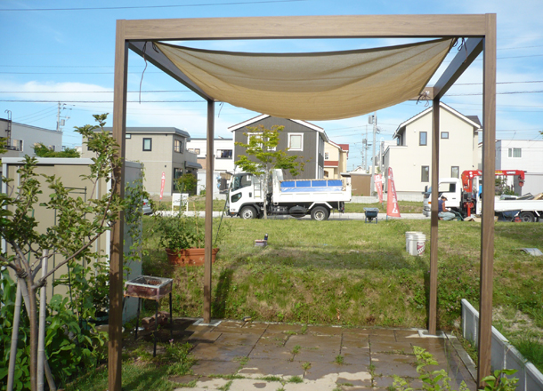 フレームポーチ:お庭の平板設置スペースにフレームポーチを設置させていただきました。 今回使用したフレームポーチは柱と梁だけで構成されたシャープな印象のデザインです。躯体と独立し施工可能な為、使用場所を選ばす、開放感を満喫することができます。 オプションで使用しているシェードは、紫外線を90%カットし床面温度を約11°下げる効果があり、快適に過ごすことができます。 他にも施工条件やご要望に合わせ様々なタイプの商品がございますので、お気軽にお問い合わせ下さい。