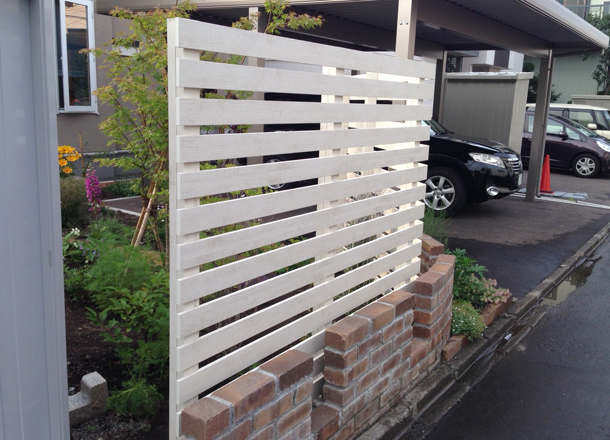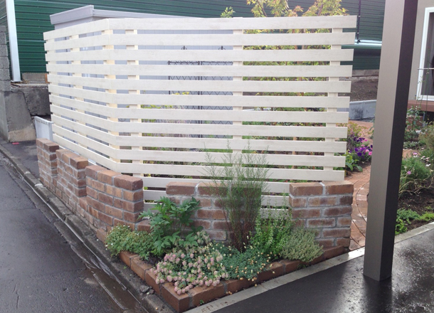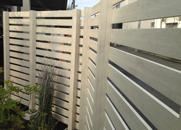 お庭の目隠しとして使用したデザイナーズパーツは、100%リサイクル材の人工木材です。本物さながらの凹凸や風合いが表現されています。植栽やプランターとの相性も良く、トータルコーディネートすることで、ナチュラルであたたかみのある空間を演出できます。モダン住宅とコーディネートしやすいアルミ形状色、天然木さながらの木目が特徴のマテリアルカラー、木目に沿った凹凸を忠実に再現した浮造り調カラーの3つのカテゴリーから全17色を設定、豊富なバリエーションから最適なカラーが選べます。