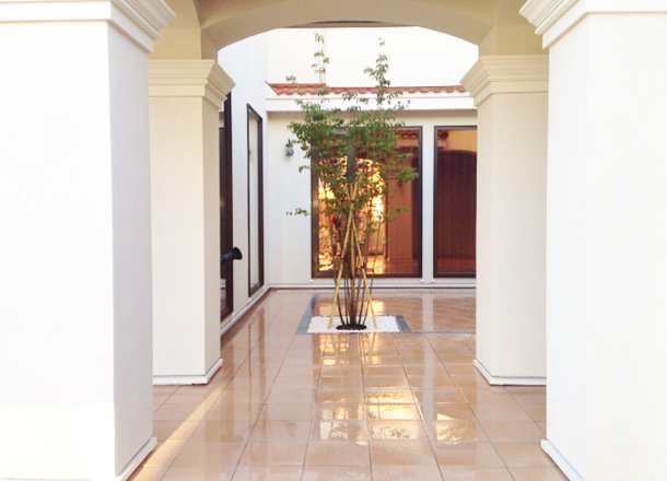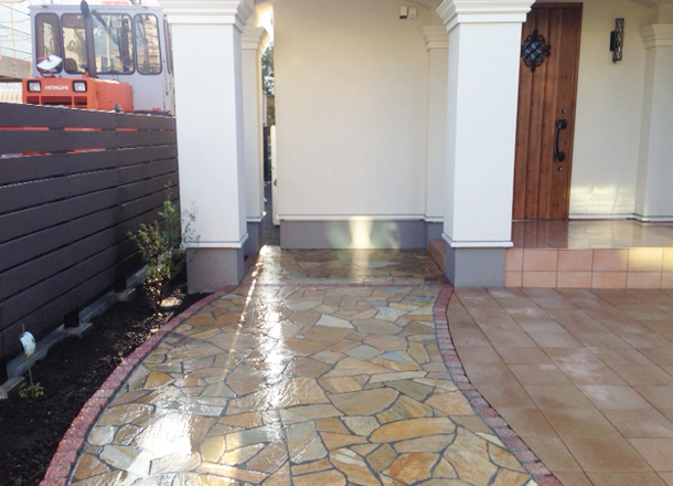 天然石貼り、インターロッキング、電気錠式門扉、塀、境界フェンス、植栽