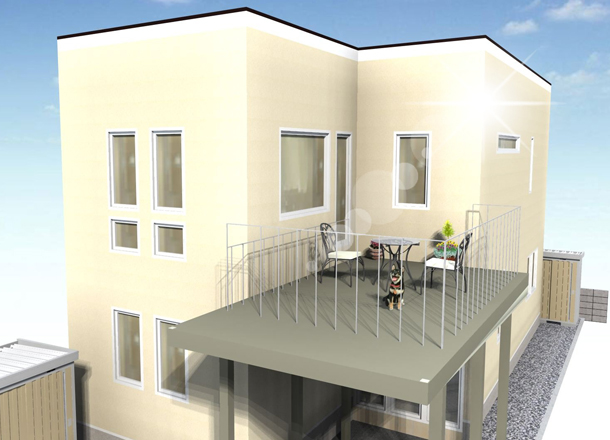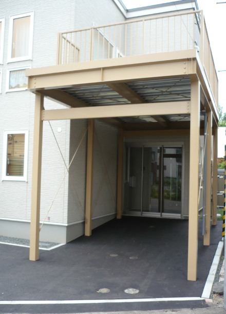 鉄骨カーポートの上部に手摺を設置しデッキとしても使用できるようにしました。また、エントランスへの導線にカーポートを設置することで、冬の除雪軽減にもなります。