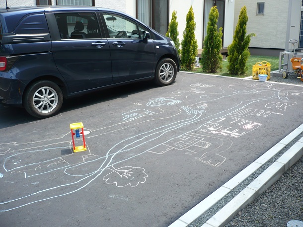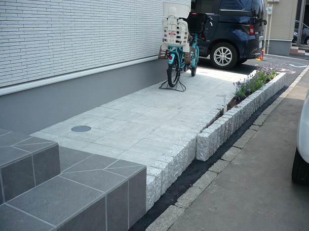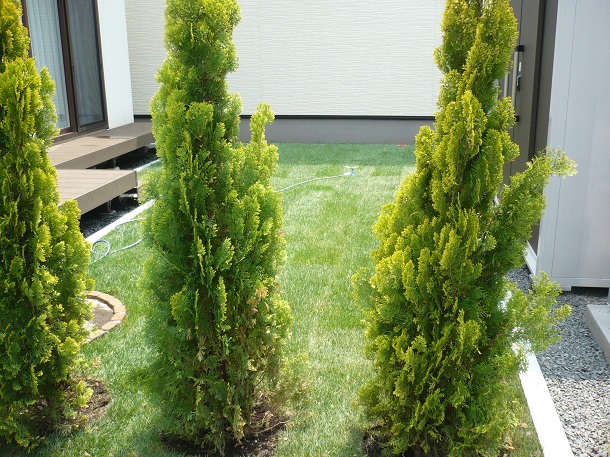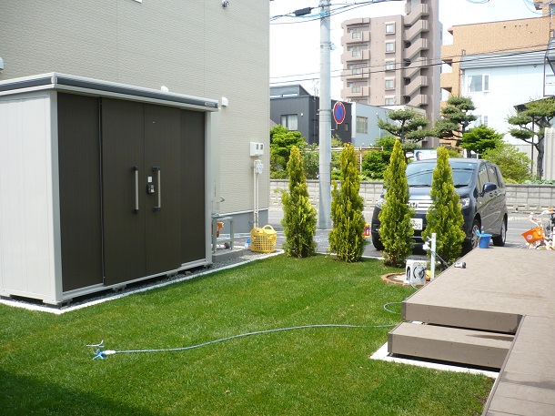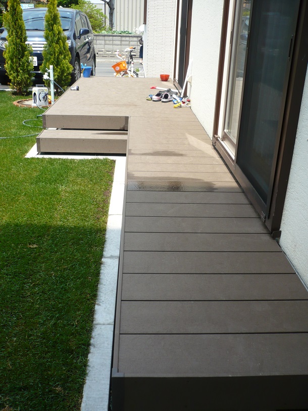 路盤・樹脂デッキ・立水栓・植栽・物置リビングからお庭へ繋がる場所にメンテナンスが楽な樹脂デッキを使用。 天然芝を敷いたことでお庭全体が青々しく明るい印象に。 お庭と駐車スペースの間に植栽を植えることにより、道路側からの自然な目隠しにも役立ちます。 樹脂デッキは、好みに合わせてカラーやサイズの加工等選ぶことができますのでお気軽にご相談ください。