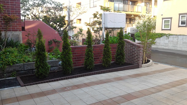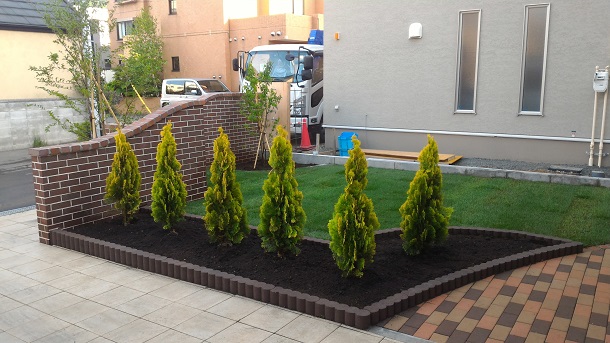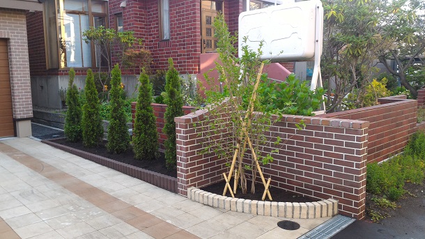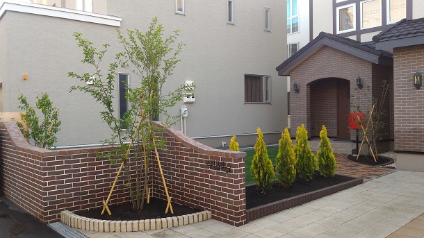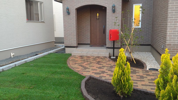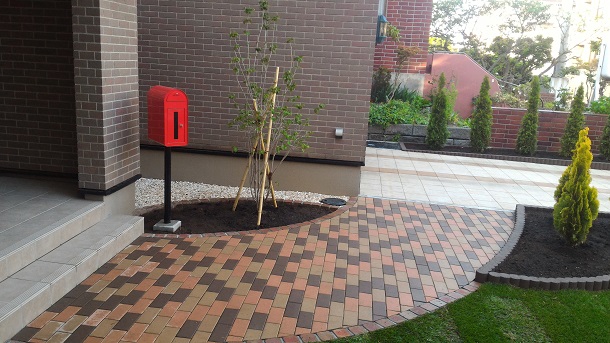 路盤、塀、植栽、ポスト塀はお家に合わせて落ち着いた色味で汚れにくいタイル貼の塀にしました。 おうちや塀がシックな色味なので、インターロッキングを明るい色にし、天然芝を敷くことで明るい印象に。 赤いポストもポイントになり、おうちの雰囲気にあった素敵なエクステリアになりました。