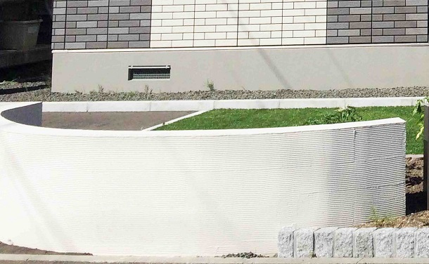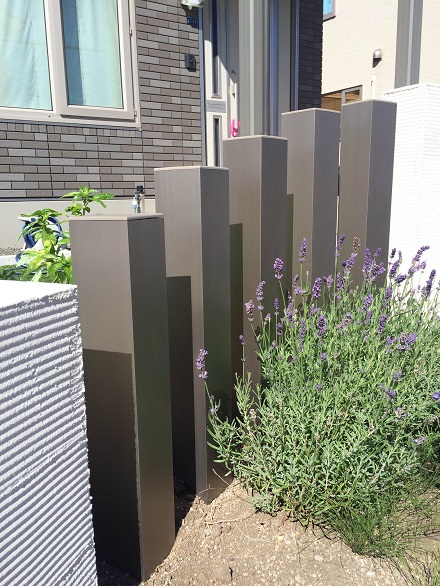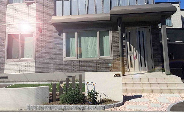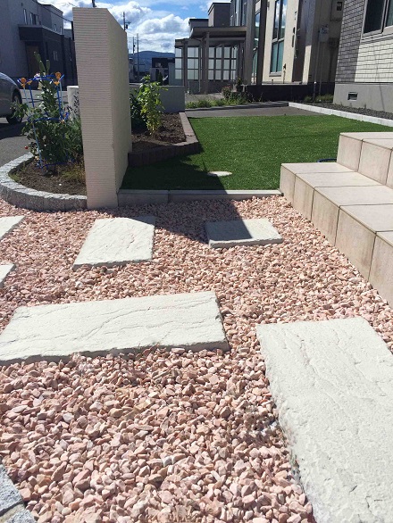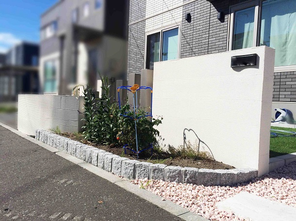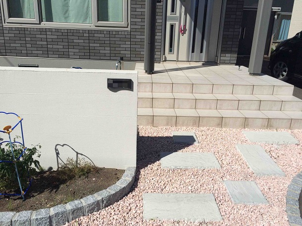 路盤、塀 塀は、丸くカーブを入れて施工することにより、柔らかい印象を与えました。 アプローチには、大きさの違うネオストーンを敷き、オリジナリティを。 さらに、塀の間にはお家の色に調和するカラーのスリットフェンス用格子材を立て 、お家と外構のカラーの調和を考慮しました。