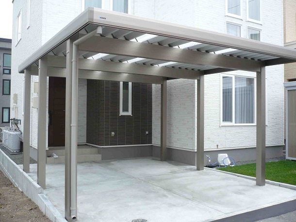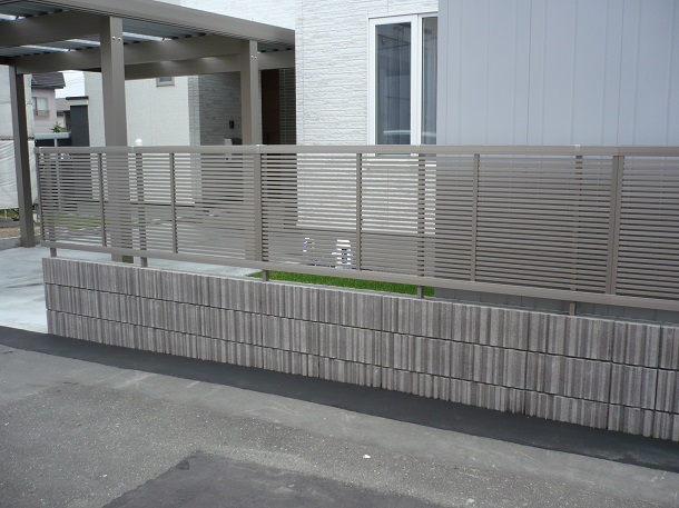 路盤、カーポート、物置、塀、フェンス 玄関前にカーポートを設置することで、冬場は玄関前の除雪軽減につながるよう お客様の負担軽減も考慮したプランニングをさせて頂きました。 ブロック塀の上には、フェンスを設置することで解放感のある門まわりに。 さらにカーポートと塀のカラーを合わせることで、統一感のある外構に仕上げました。