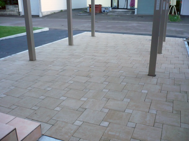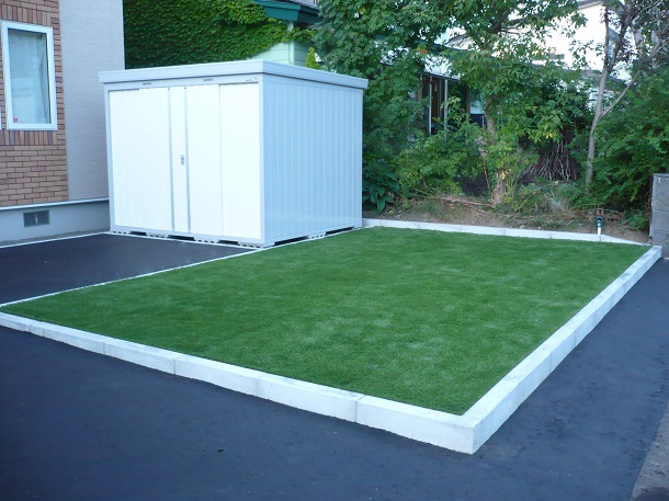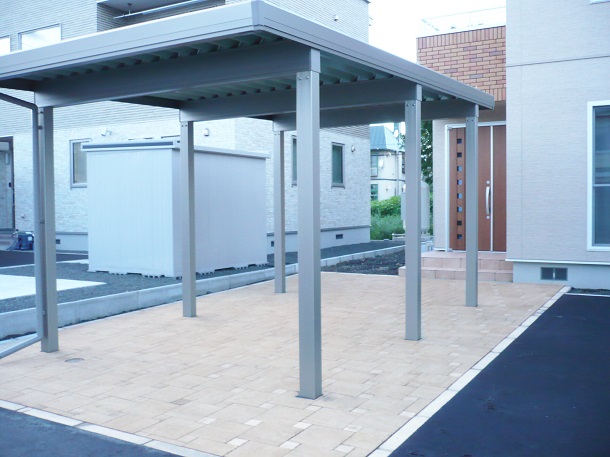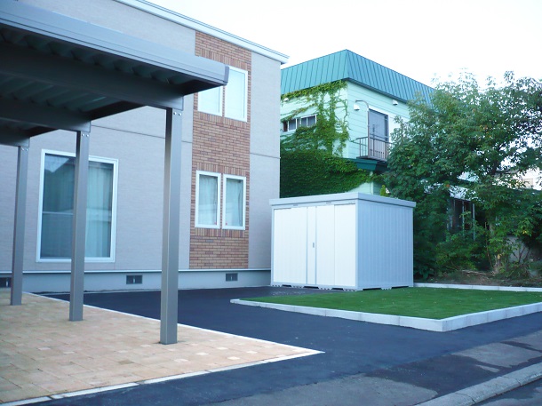 路盤、カーポート、物置 カーポートは雪と風に強い、北海道の冬に最適な【ウィンスリーポートⅡ】を設置。 さらに、玄関前に設置することで、冬は玄関前の除雪軽減というメリットがあります。 インターロッキングはロシェ・ナチュラルを使用し、人工芝が映えるよう明るい印象にしました。