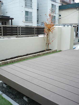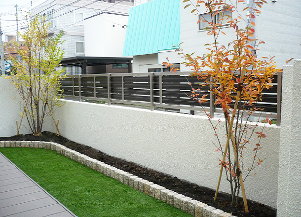 路盤、門、フェンス、デッキ、花壇 フェンスにはLIXILの【セレビューフェンス RP3型】を使用し、 スタイリッシュで高級感あふれる門廻りに仕上げました。 お庭には、門に沿って花壇を作ることで、 お庭全体が明るい印象になるようプランニングしました。 そして広々としたデッキは、夏にはBBQや洗濯物を干すスペースとして 充実した外構になっています。