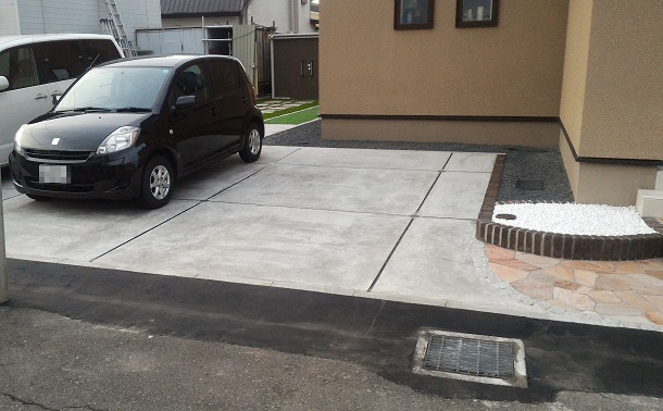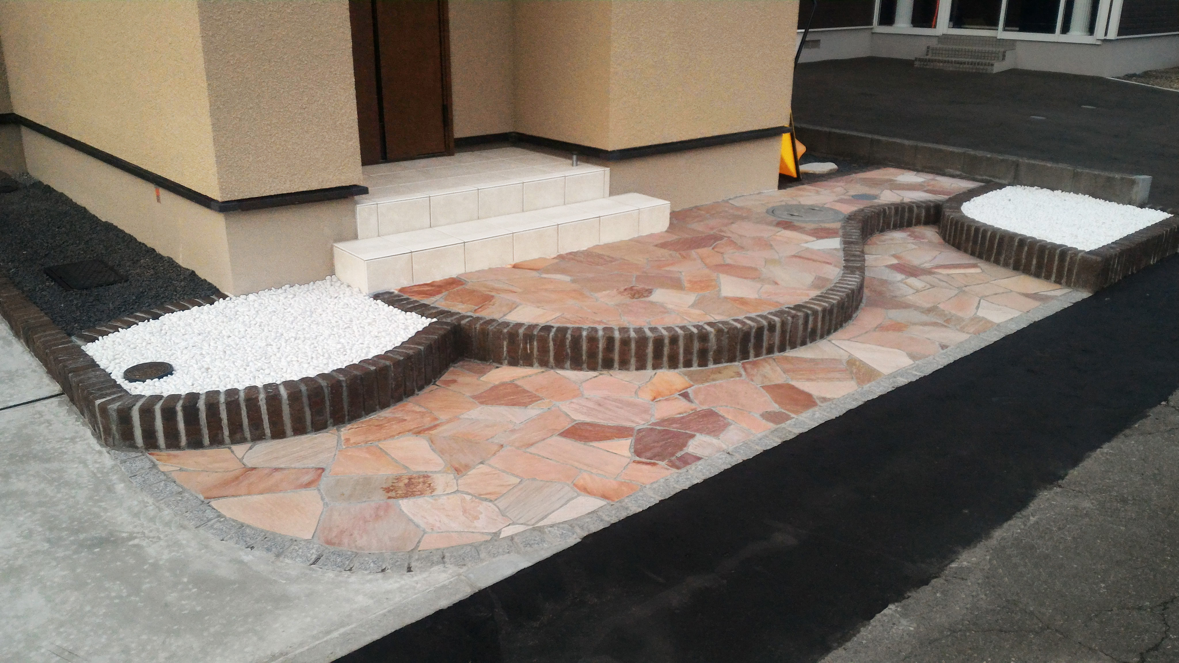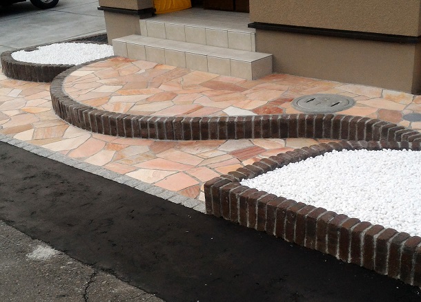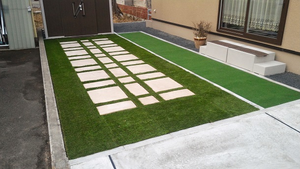 路盤 アプローチには【天然石 アースクォーツ乱形】を使用し、 お客様のご要望に合わせ、デザイン性重視のご提案をさせて頂きました。 お庭は、お手入れが楽な人工芝を敷き、 物置に続く道には英国の自然石の表情を再現した 【アクシア・トラッド】という平板を敷くことでナチュラルモダンに仕上げました。