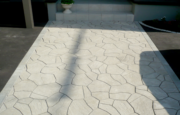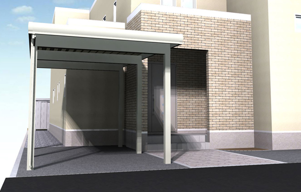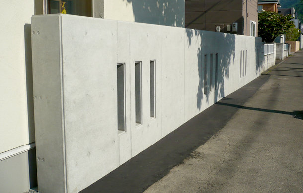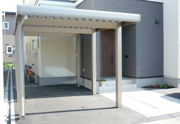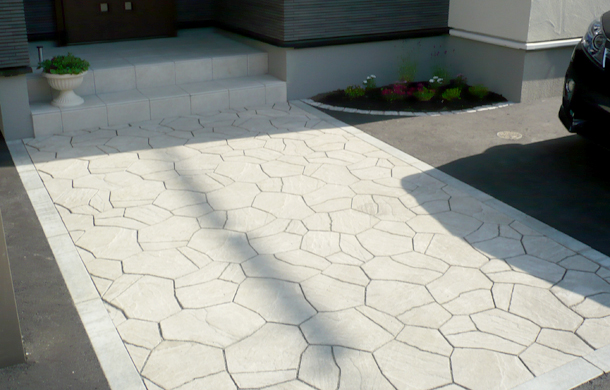 路盤、塀、カーポート:塀はRC打ちっぱなしで高さがあるため、スリットを入れて明かりが入るようになっています。玄関前のアプローチには新しい質感を持ったインターロッキングのピエラを使用しています。