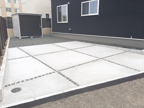 路盤 駐車スペースにはコンクリート土間を敷き、 仕切にピンコロ石のブラックを使うことで お家のデザインとの統一感を出しています。 玄関ポーチの前はアスファルトを敷き、ポーチの個性を 引き出せるようにシンプルな施工にしています。