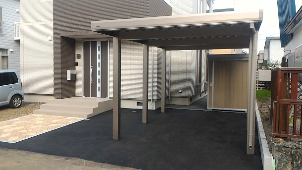 路盤、カーポート、物置 インターロッキングは【ティーナ】のベージュを7割とイエロー3割で施工しました。 【ティーナ】は、古代ローマの街道のような石張りの世界を演出できます。 カーポートは文化シヤッターの【BXポート】の1台用を設置。 カラーはアーバングレーでお家や路盤の色の系統に合わせています。