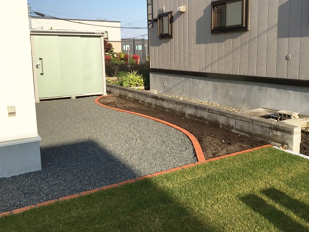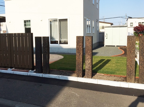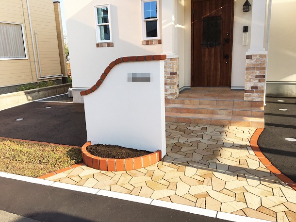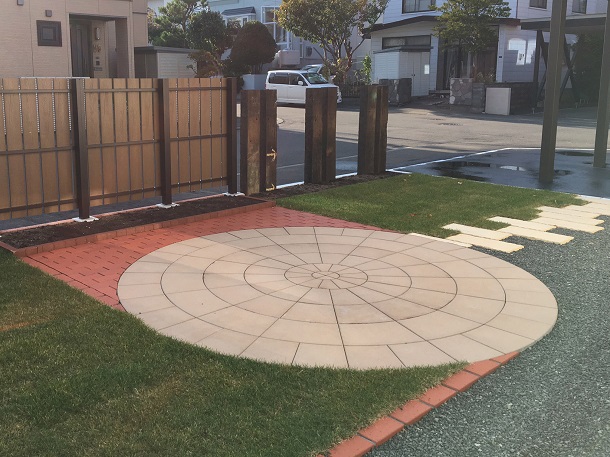 塀、路盤、フェンス インターロッキングには【ピエラ】を、 お庭には円形の舗装材【サークルペイブ】を使用しています。 塀は上部をなだらかにカットし、笠木にはレンガを使っています。 夕陽の似合う、素敵な外構になりました。