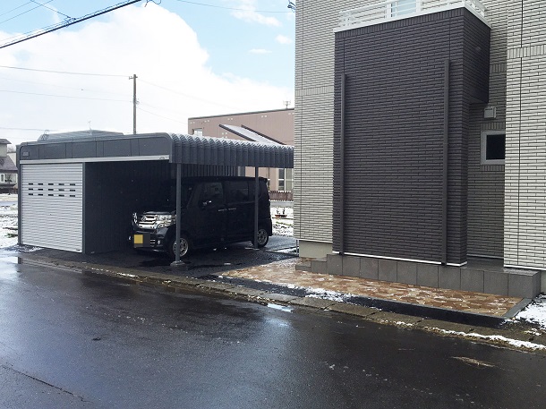 路盤、ガレージ+カポート工事、樹脂デッキ カスケードガレージのカーポート連棟タイプを使用。 オプションでドアをつけているので出入りがとても便利になっています。 2台用のカスケードガレージよりもすっきりとしたシルエットなので スタイリッシュにみせることが出来ます! インターロッキングには【ピエラ】を使用し、 樹脂デッキは【樹ら楽ステージ】を使用しています。