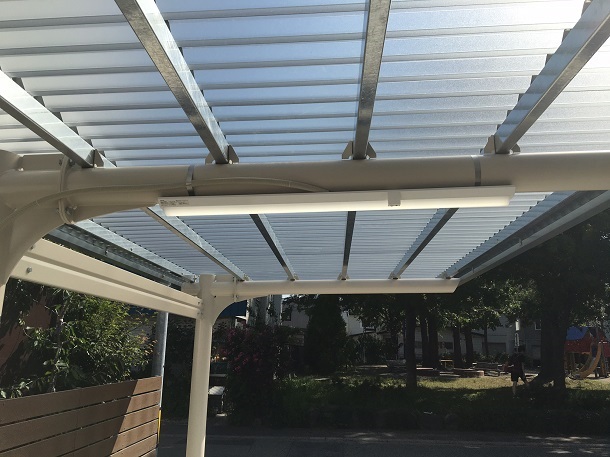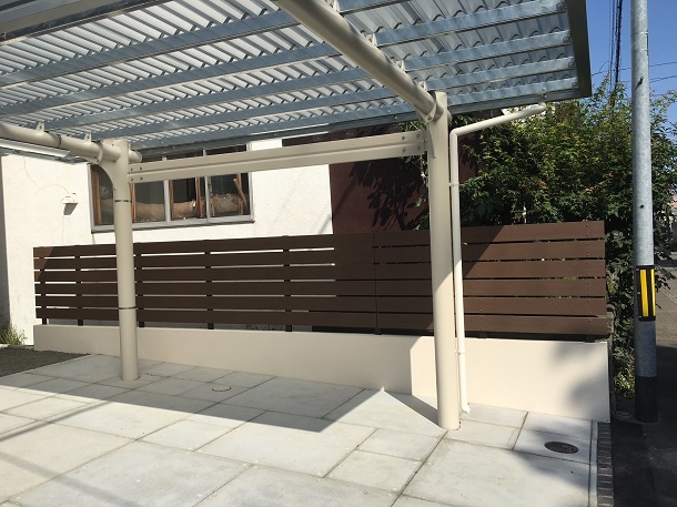 路盤、カーポート、塀、フェンス 路盤にはドットペイブの500角と1000角をランダムに使用し、 仕切にはピンコロを敷いています。 カーポートには家CAR天下のソラフルを設置することで スタイリッシュな印象を与えます。 そして、フェンスには長持ち+メンテナンス要らずの ネオカットウッドボードフェンスを使っています。
