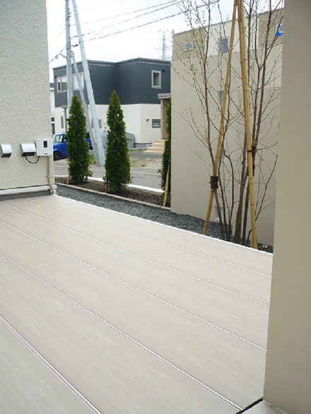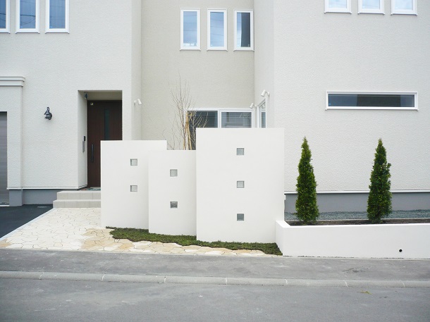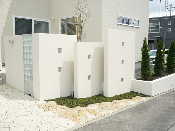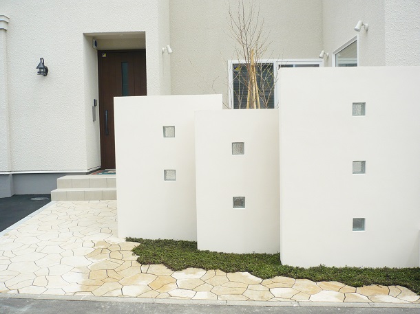 路盤、塀、デッキ 路盤にはインターロッキング【ティーナ】を使用し、 塀の下部分にはアクセントとしてハーブマットを敷いています。 塀にはガラスブロックを埋め込むことで明るく印象的に仕上げました。 デッキはモデンでシックな印象を与える 【ラステラ】のグレーマーブルを使用しています。
