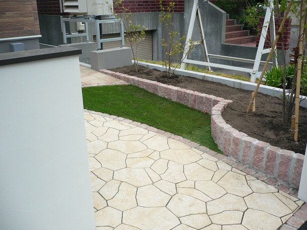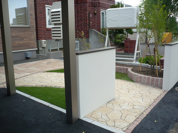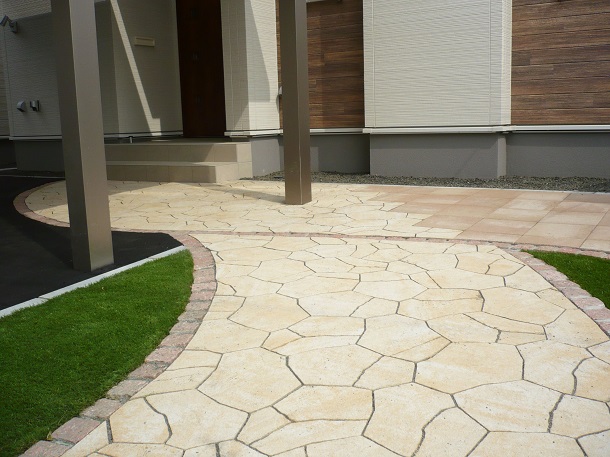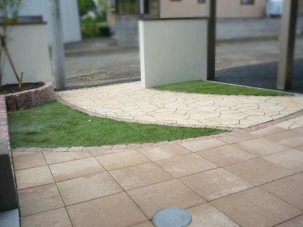 塀、路盤、花壇、カーポート インターロッキングにはティーナとロシェの2種類を使用し、 アプローチにデザイン性を出しています。 緑は人工芝を使用しているのでメンテナンスが楽なアプローチになっています。