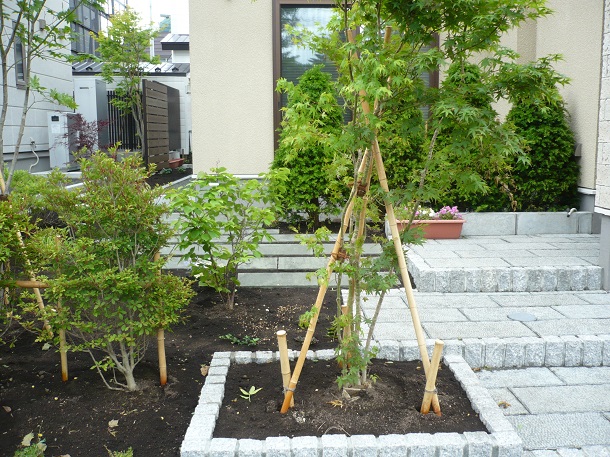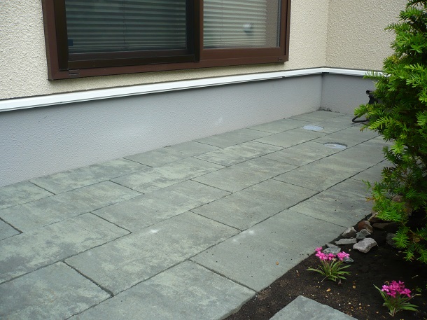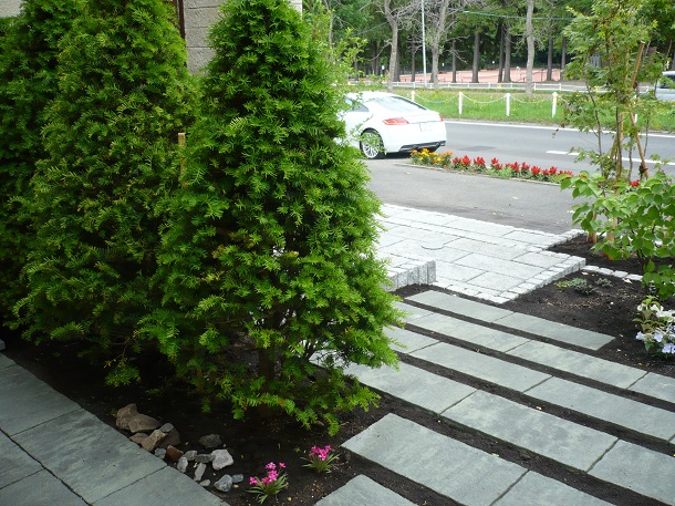 路盤、植栽、フェンス 路盤にはカルムペイブを使用し、ピンコロ石の白で仕切りを入れています。 全体的に白色と植栽の緑で綺麗な印象に仕上がっています。 家の窓から外を見たときに植栽が目立つように樹脂フェンスの設置もしています
