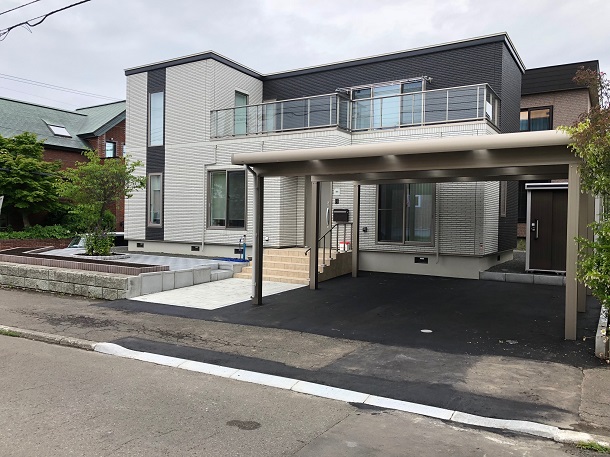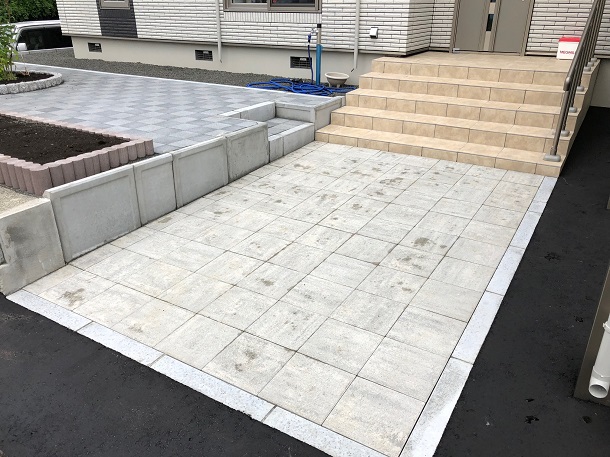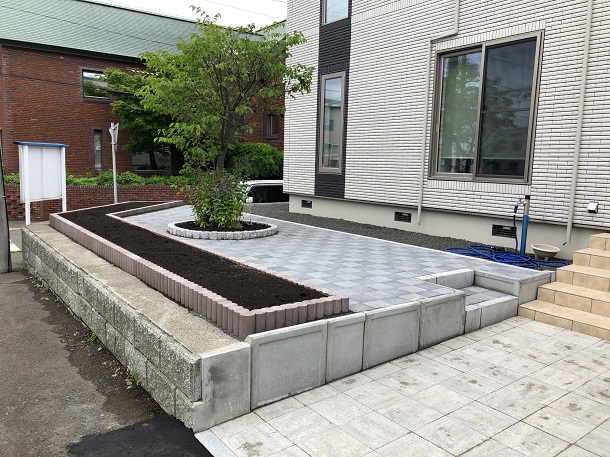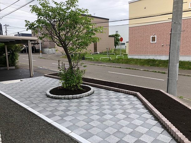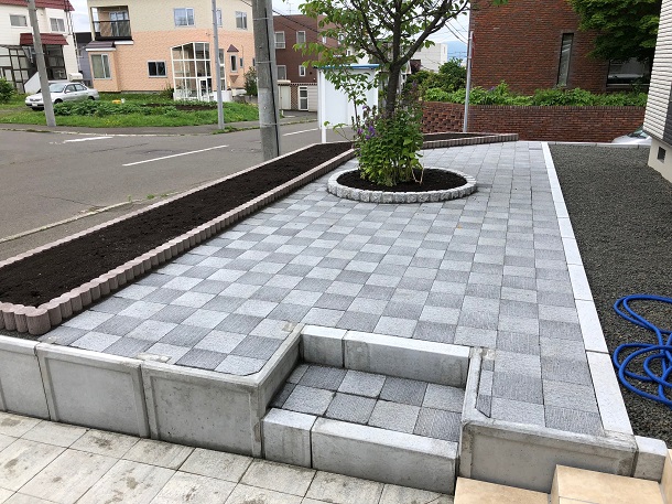路盤、カーポート、物置 路盤にはロシェとコルゲートを組み合わせ、 既存の樹木を活用し、ピンコロ石で囲い花壇もつくっています。 カーポートは2台用を設置しています。