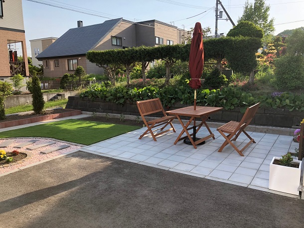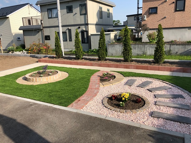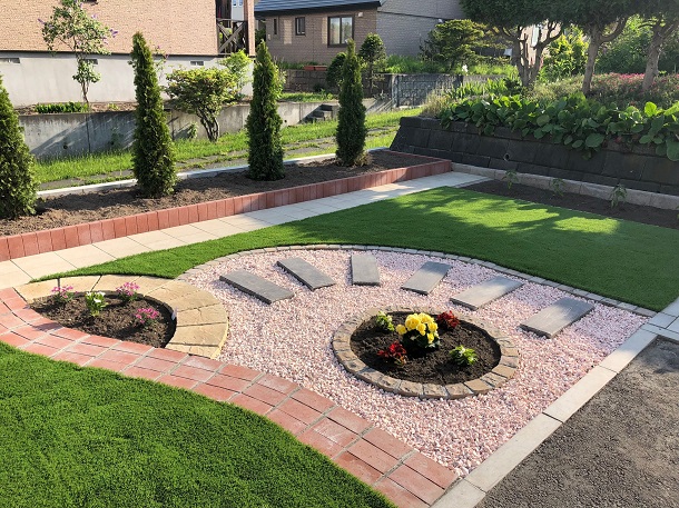路盤 路盤にはロシェ300角やネオストーンを使い、 仕切りにはレンガブロックやグルバストーンを使っています。 カントリーでかわいらしいイメージがお好きな方にオススメな施工例です。