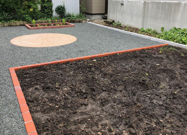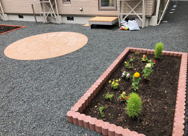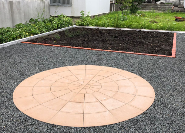 路盤、庭、カーポート、物置:お庭の中心に配置した【サークルペイブ】は、円形や半円形の素敵なデザインが可能な商品です。お庭の雰囲気に合わせて様々なデザインができますので、お気軽にお問い合わせください。
