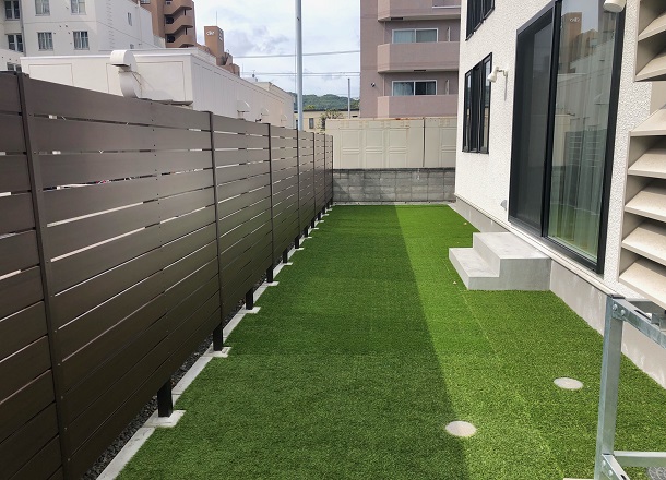 路盤工事:インターロッキング敷き(リビオ) 植栽工事:グリーンコーン H1.5m フェンス工事:F&F マイティウッドベーシック H1.8m