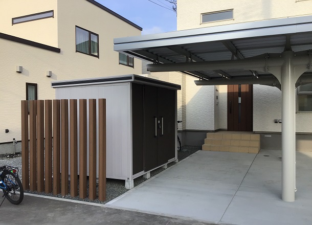 路盤工事:土間コンクリート カーポート工事:ショーワ SW-2Z お庭工事:階段(ピンコロ石、コンクリート平板)、人工芝 フェンス工事:F&F マイティウッドベーシック H1.2m 物置工事:ヨド物置 LMDS-2518 その他工事:F&F スタイリッシュポール
